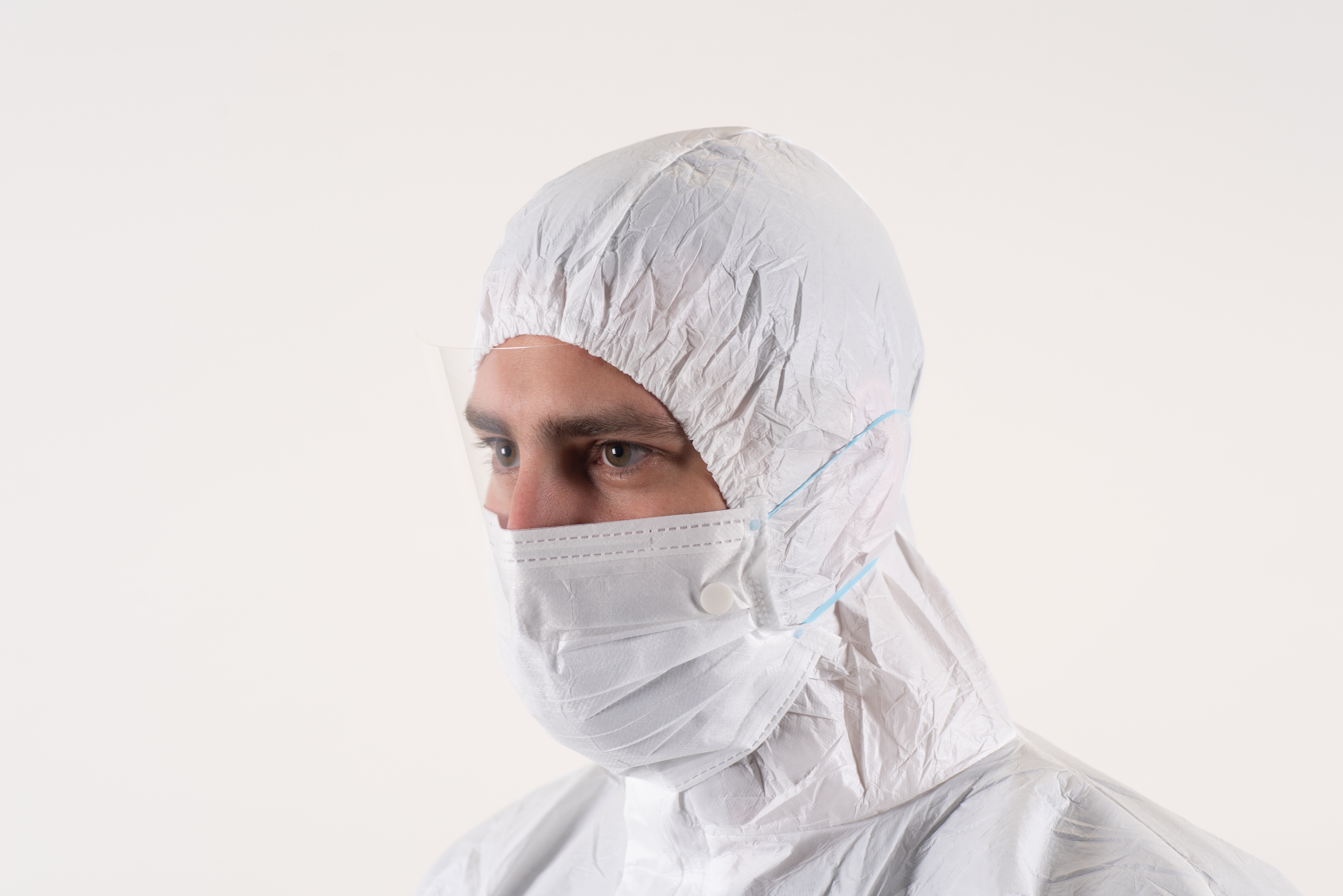 Disposable lab coat with snap buttons and without a hood.